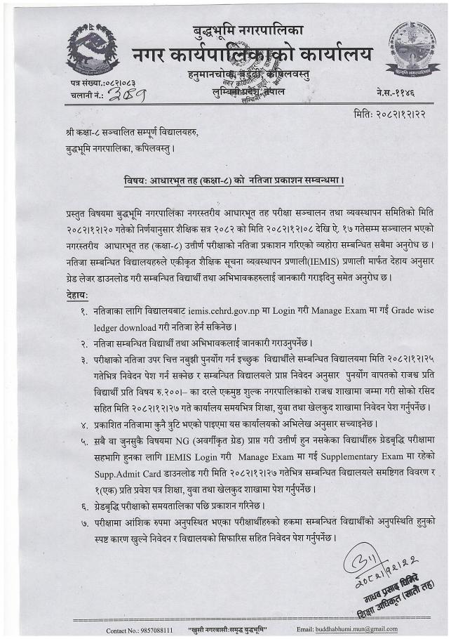 कक्षा-८ सञ्चालित सम्पूर्ण विद्यालयहरु, आधारभूत तह (कक्षा-८) को नतिजा प्रकाशन सम्बन्धमा।