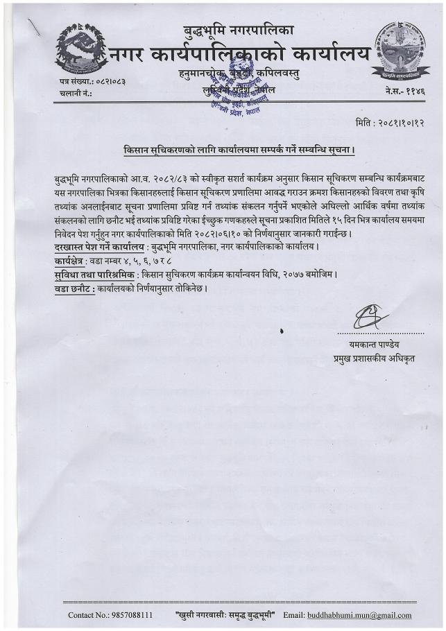 किसान सूचिकरणको लागि कार्यालयमा सम्पर्क गर्ने सम्बन्धि सूचना।