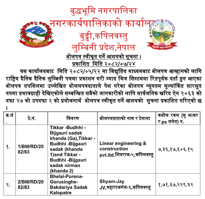 » बोलपत्र स्वीकृत गर्ने आशयको सूचना।