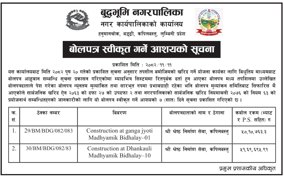 बोलपत्र स्वीकृत गर्ने आशयको सूचना। Bid no 26