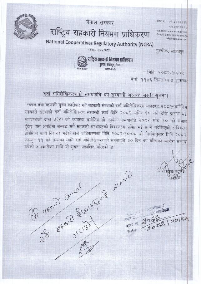 राष्ट्रिय सहकारी नियमन प्राधिकरणमा सहकारी दर्ता अभिलेखिकरणको समयावधि थप सम्बन्धी अत्यन्त जरुरी सूचना।