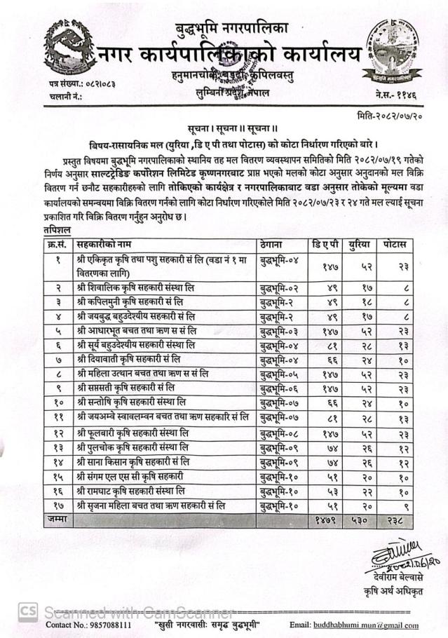 रासायनिक मल (युरिया तथा डि ए पी) को कोटा निर्धारण गरिएको बारे।