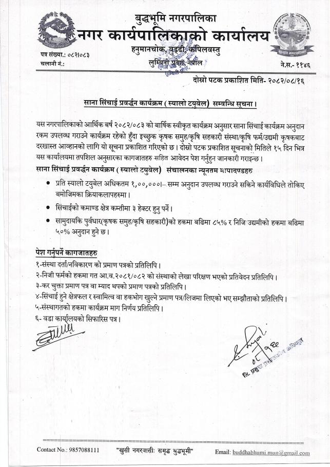 साना सिंचाई प्रवर्द्धन कार्यक्रम (स्यालो टयुबेल) सम्वन्धि सूचना।