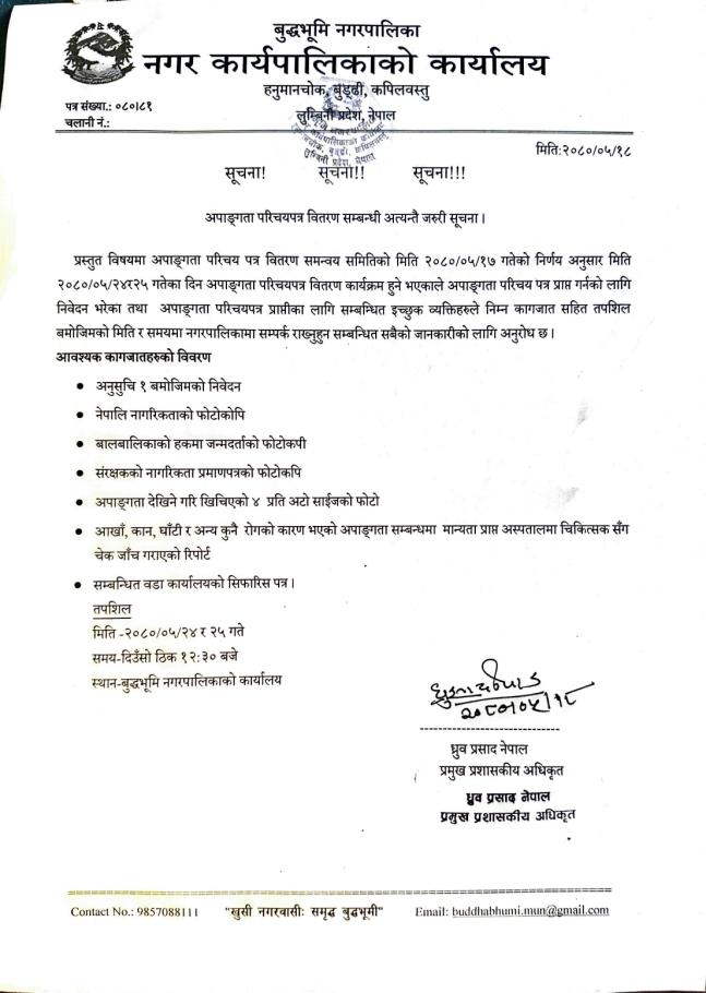 अपाङ्गता परिचयपत्र वितरण सम्बन्धी अत्यन्तै जरुरी सूचना !