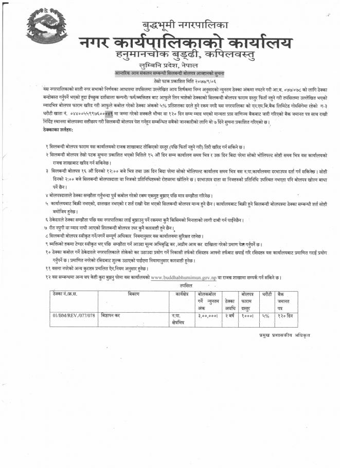 बुद्धभूमि नगरपालिकाको चमेना गृह (क्यान्टिन) सञ्चालन सम्बन्धी शिलबन्दी दरभाउपत्र प्रस्ताव आव्हानको सुचना (पहिलो पटक सूचना)