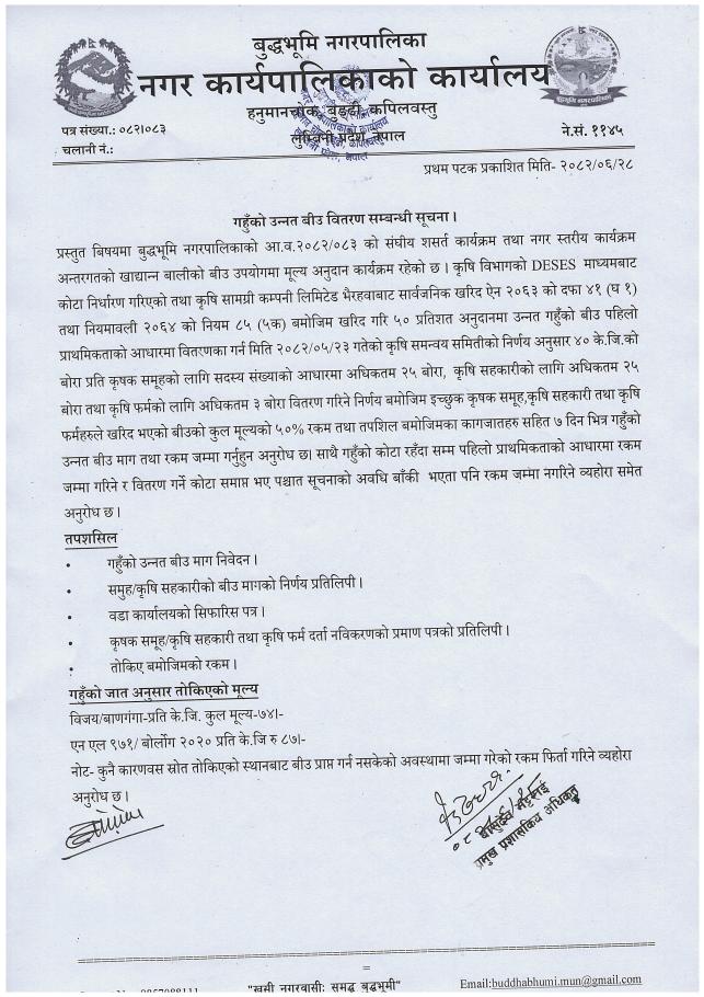 गहुँको उन्नत बीउ वितरण सम्बन्धी सूचना।