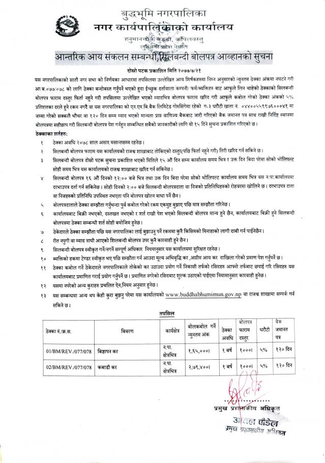 दोस्रो पटक प्रकाशित आन्तरिक आय संकलन सम्बन्धि सिलबन्दी बोलपत्र आव्हानको सूचना ।