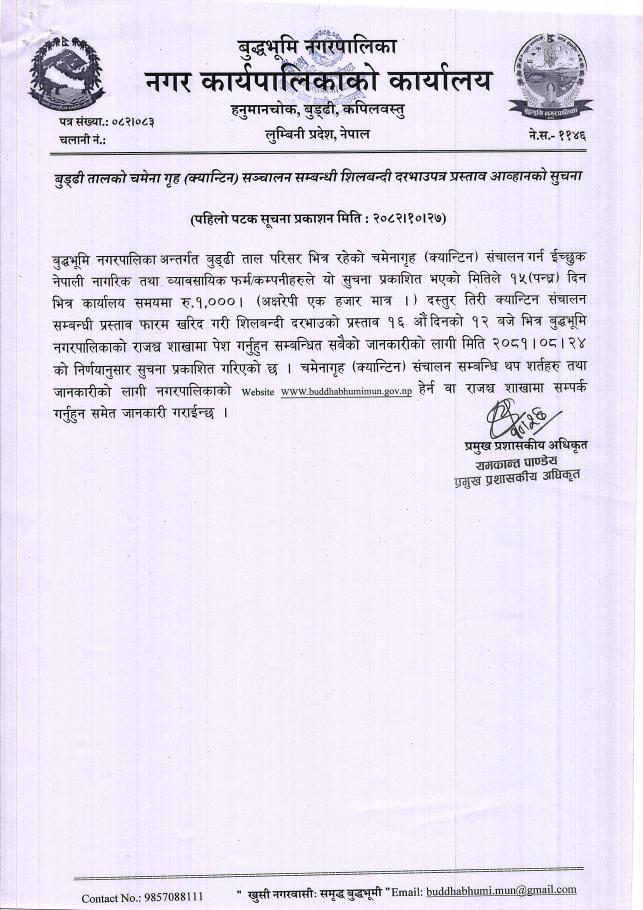 बुड्ढी तालको चमेना गृह (क्यान्टिन) सञ्चालन सम्बन्धी शिलबन्दी दरभाउपत्र प्रस्ताव आव्हानको सुचना !