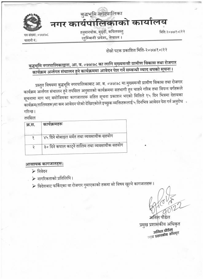 बुद्धभूमि नगरपालिकाद्वारा, आ. व. ०७७।७८ का लागि मुख्यमन्त्री ग्रामीण विकास तथा रोजगार कार्यक्रम अर्न्तगत संचालन हुने कार्यक्रममा आवेदन पेश गर्ने सम्बन्धी म्याद थपको सूचना ।