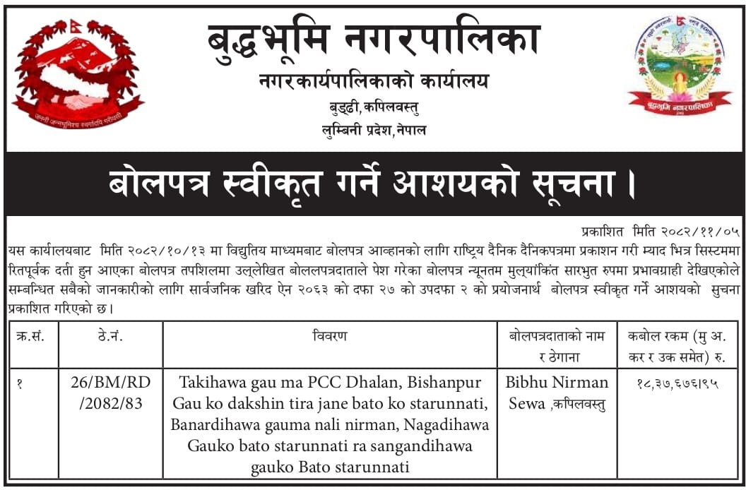 बोलपत्र स्वीकृत गर्ने आशयको सूचना। Bid no 26