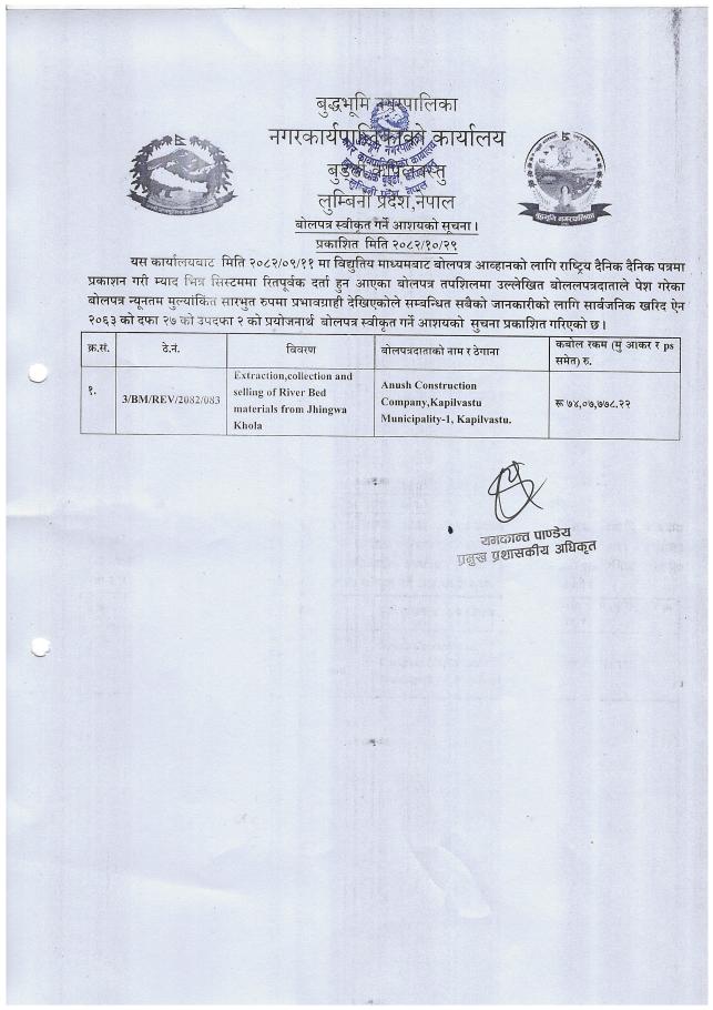 बोलपत्र स्वीकृत गर्ने आशयको सूचना। Bid no 3