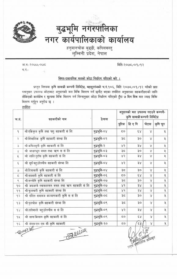 रासयनिक मलको कोटा निर्धारण गरिएको बारे ।