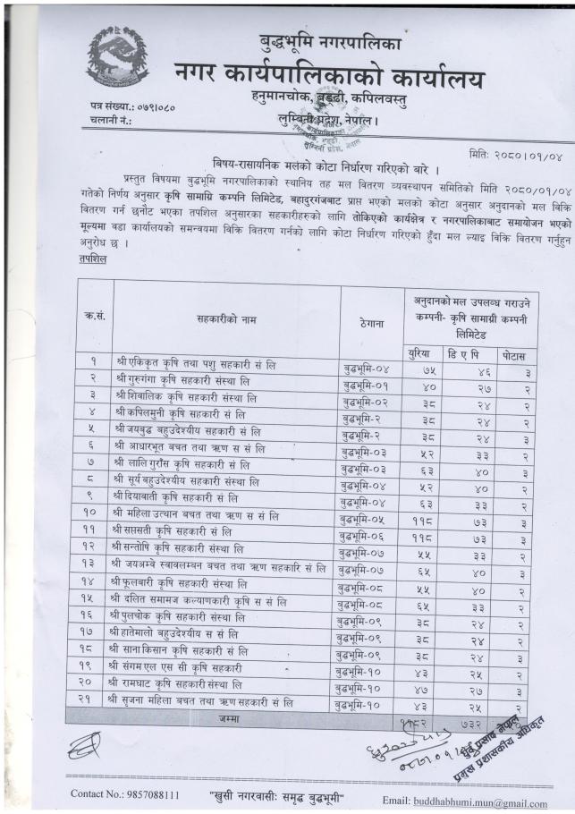 रासायनिक मलको कोटा निर्धारण गरिएको बारे ।