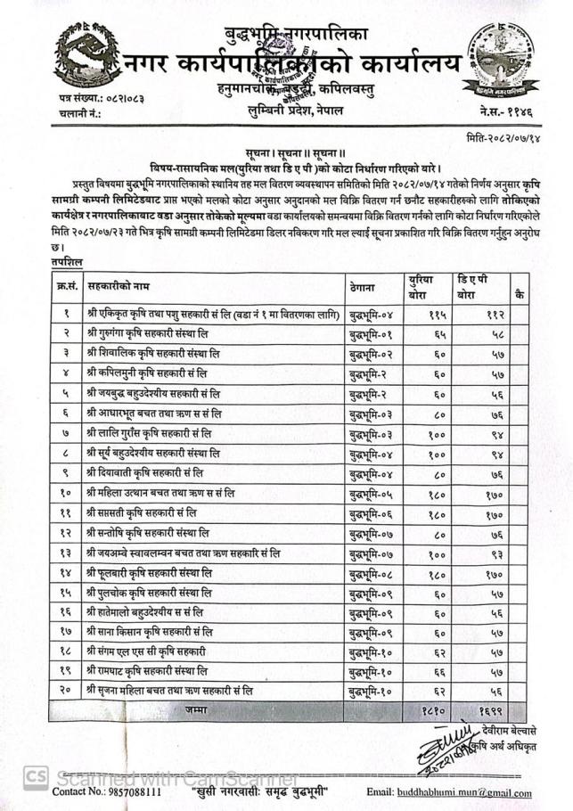 रासायनिक मल (युरिया तथा डि ए पी) को कोटा निर्धारण गरिएको बारे।