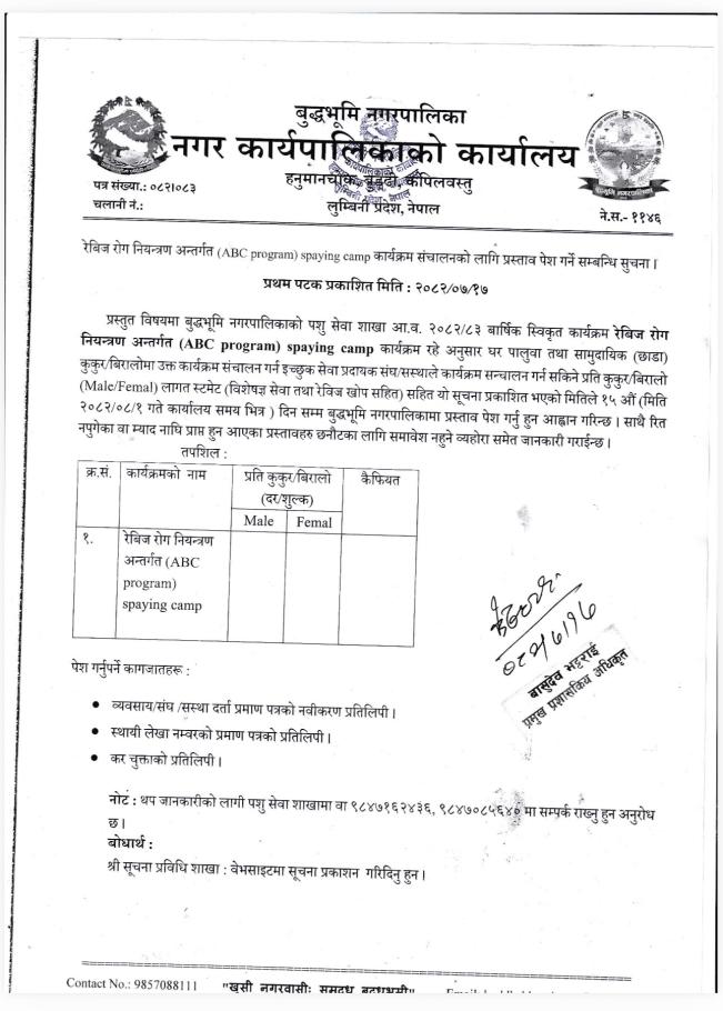 रेबिज रोग नियन्त्रण अन्तर्गत (ABC program) spaying camp कार्यक्रम संचालनको लागि प्रस्ताव पेश गर्ने सम्बन्धि सुचना ।
